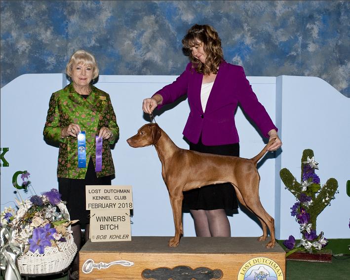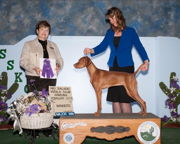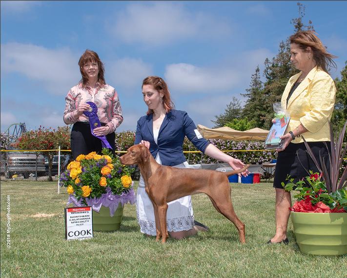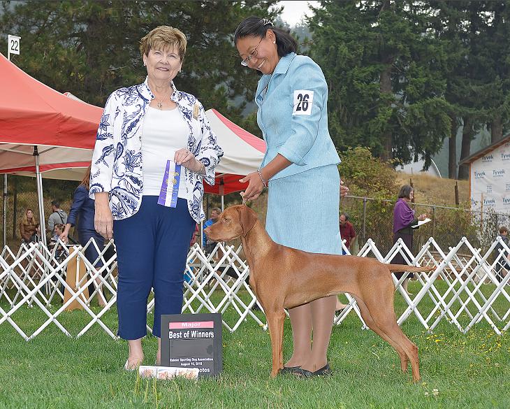 "PEARL" finished quite easily with 3 major wins with 2 being at a specialty show and the third at a Sporting Dog Specialty Show. The first and third she took under a Vizsla breeder judge and the second one she took on a trip south to CA. "PEARL" lives full time with her family in Anacortes, WA.