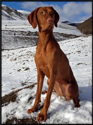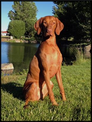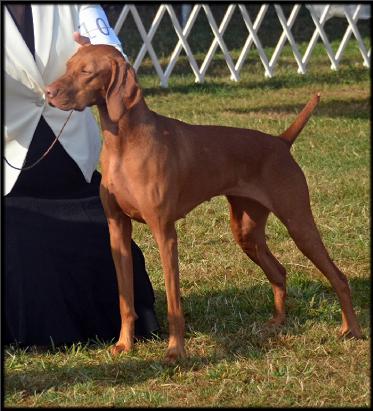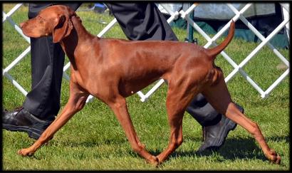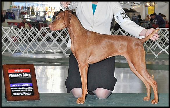 Tierah Vizslas. She was one of our slow maturing females. She has always done very well at the shows but it wasn't until Fall 2014 that she started to gain points toward her AKC Championship. She finished her Championship with 7 straight wins in a row and her final one was on the first day during a specialty weekend with a huge number of competition entailing a 5 point major win. She really enjoys Lure Coursing and is often the fastest one in the test. She has passed her Canine Good Citizen test and lives with her family full time in Lenore, ID where they continue to polish up her skills for Rally Obedience.
